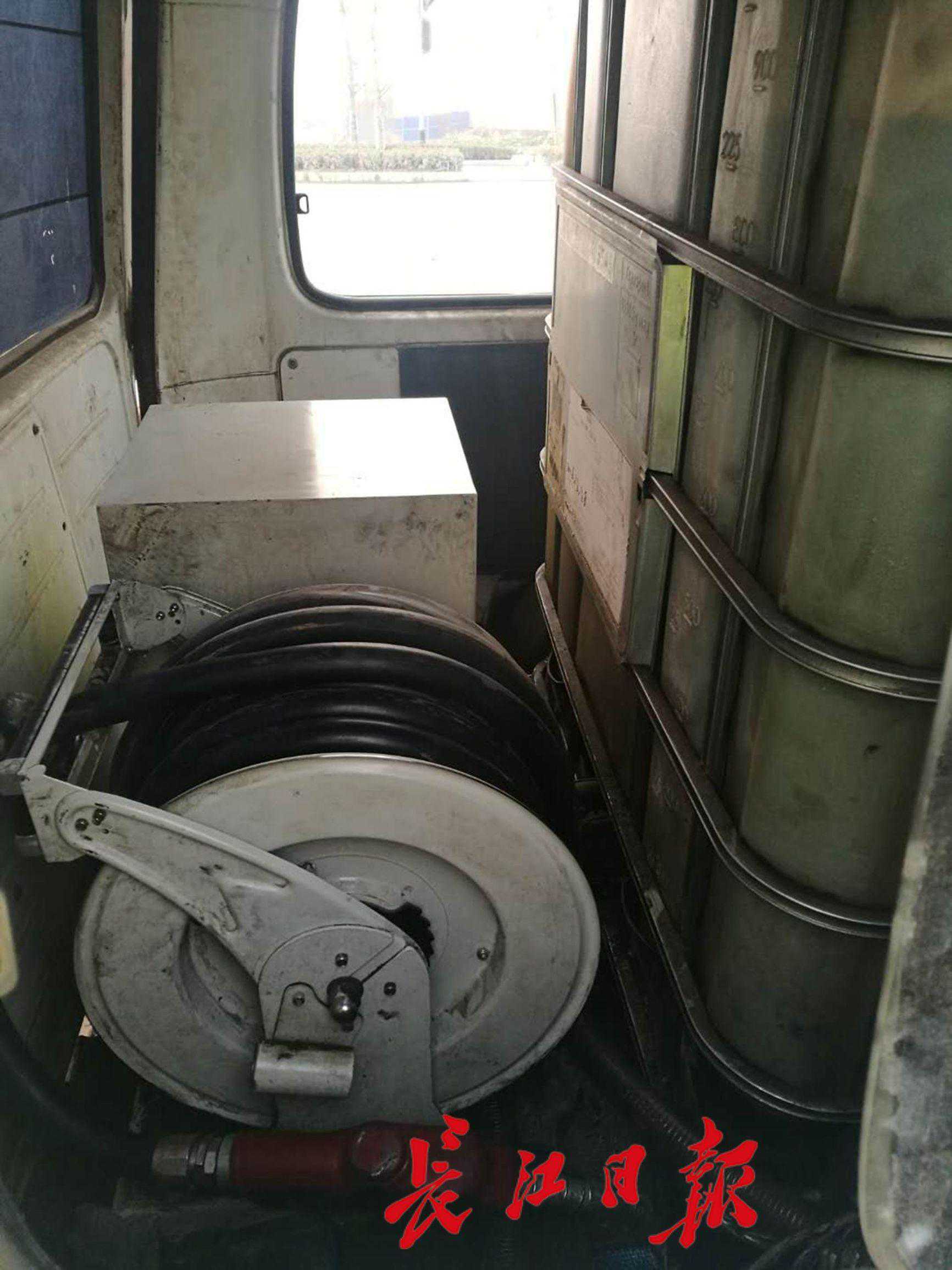 汽油车为何会飘出柴油味?左双勇立即跑步上前责令面包车停靠在路边接受检查。当左双勇打开金杯面包车车门时,被眼前的情景所震惊,不大的车厢内竟然安装有电动加油泵枪、计量器及装有柴油的储油罐,这是一辆非法改装的流动加油车,安全隐患严重。