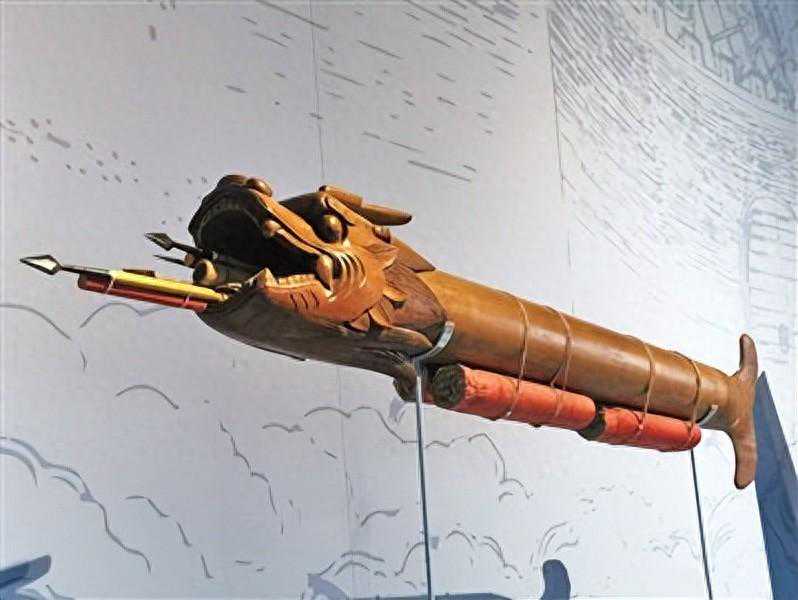 此外,还有以龙命名的远射火器。其中,最著名的就是明朝中期发明的火龙出水。据《武备志》记载,火龙出水的制法是将5尺茅竹去节并用铁刀刮薄,然后木制的龙头、龙尾分别装到茅竹两端。然后将龙头口部向上,龙腹内装入数枚神机火箭,把火箭的药线连在一起,从龙头下部一个孔中引出,再在龙身下部前后两端各倾斜装上两个大火箭筒,把它们的药线也连在一起,最后把神机火箭的总药线连在前边两个火箭筒的底部。在作战时,火龙出水可以在距离水面三四尺高的地方点火,靠着二级火箭结构,火龙出水的射程可达2至3里,如火龙出江,更精妙的是待两侧火药筒内的火药燃完,龙腹内的火箭就会飞出攻击敌船,使敌人船俱焚。火龙出水堪称世界上发明最早的多级火箭,它也被《中国科学技术史》的作者李约瑟誉为“原始的阿波罗火箭”。