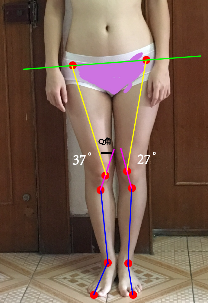 Q角,即QuadricepsAngle,又叫髌股角,它直接描述的是髌股关节的排列。但由于股骨、髌骨、胫骨的运动都会影响Q角,因此能够用来评估腿型。