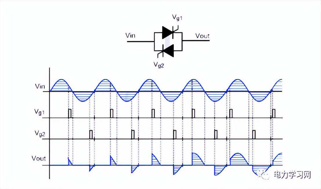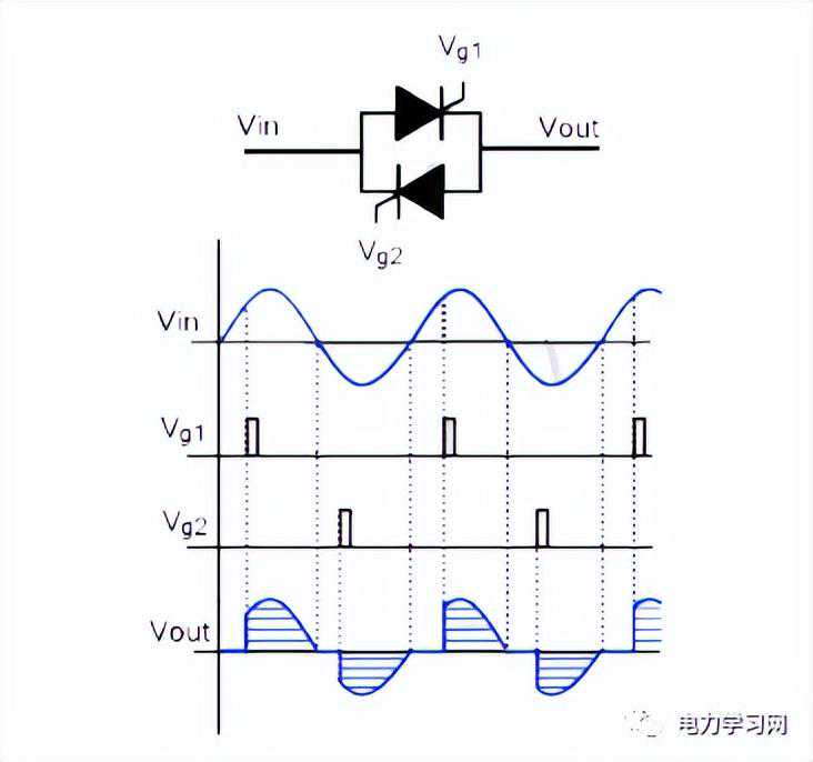 对于每一相,两个这样的晶闸管以背对背的形式连接。所以它可以控制两个方向的电流。每半个周期,点火角度