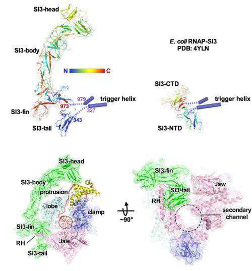 上:蓝细菌SI3与大肠杆菌SI3的结构;下:蓝细菌SI3与RNAP的相互作用。