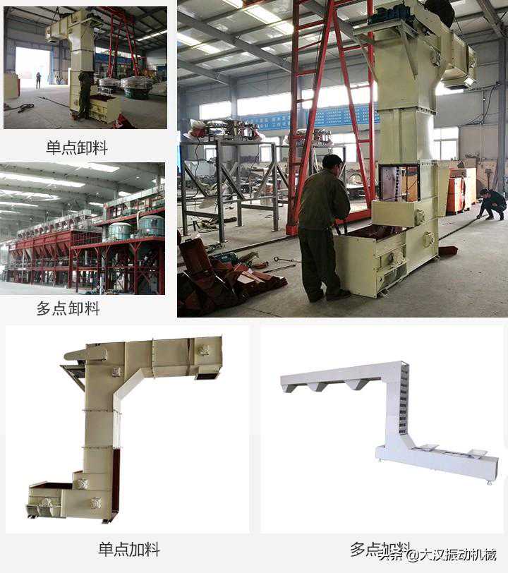 Z型斗式提升机兼有水平和垂直输送的特点。下端有进料口,出料口位于上端。进料口一般装有进料装置,如电磁振动给料机,可用于称重包装机的给料机、色选机的给料机、自动称重配料系统的多点给料,通过1台Z型斗式提升机设备满足多料仓投料需求,节省客户设备采购成本。