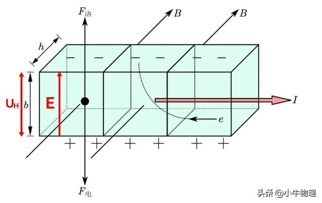 霍尔效应可解释如下:外部磁场的洛伦兹力使运动的电子聚集在导体板的一侧,在导体板的另一侧出现多余的正电荷,从而形成横向电场,横向电场对电子施加与洛伦兹力方向相反的静电力,当静电力与洛伦兹力达到平衡时,导体板上下两侧之间就会形成稳定的电势差。