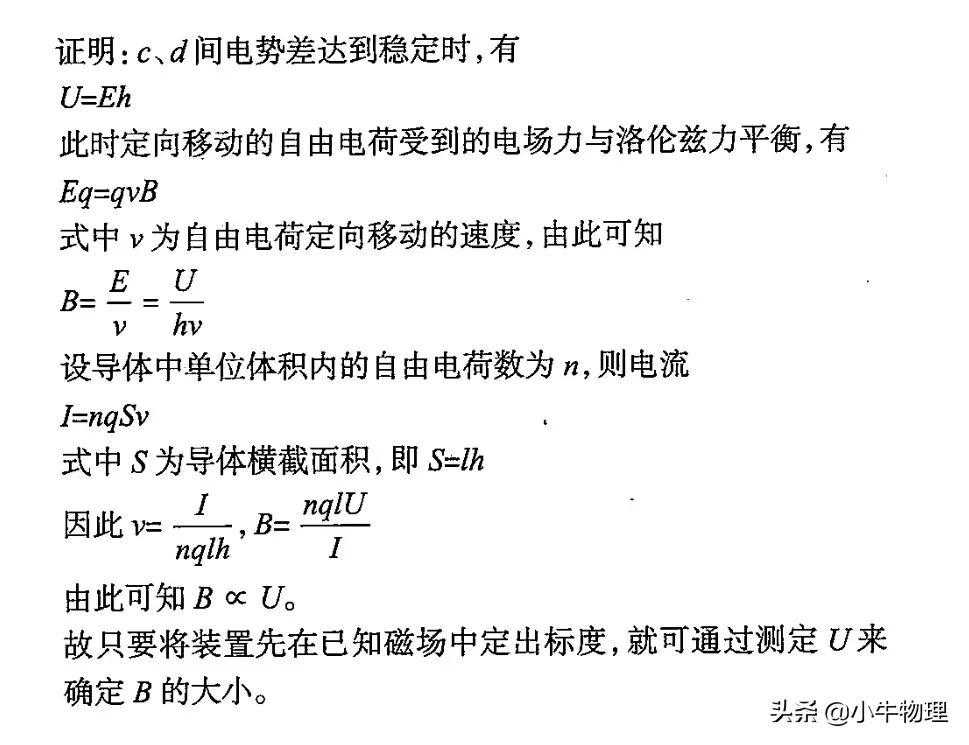例题:磁强计是利用霍尔效应来测量磁感应强度B的仪器,其原理如图所示,一块导体接上a、b、c、d四个电极,将导体放在匀强磁场之中,a、b间通以电流I,c、d间就会出现电势差,只要测出c、d间的电势差U,就可以测得B。试证明之.
