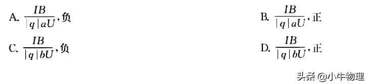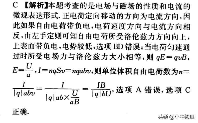 例题:如图所示,一段长方体形导电材料,左右两端面的边长都为a和b,内有带电量为q的某种自由运动电荷.导电材料置于方向垂直于其前表面向里的匀强磁场中,内部磁感应强度大小为B.当通以从左到右的稳恒电流I时,测得导电材料上、下表面之间的电压为U,且上表面的电势比下表面的低.由此可得该导电材料单位体积内自由运动电荷数及自由运动电荷的正负分别为()