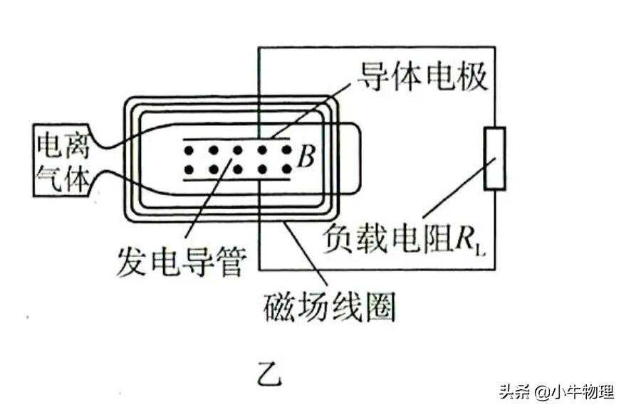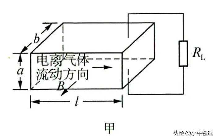 例题:磁流体发电是一种新型发电方式,如图甲、图乙所示是其工作原理示意图.图甲中的长方体是发电导管,其中空部分的长、高、宽分别为l、a、b,前后两个侧面是绝缘体,上下两个侧面是电阻可忽略的导体电极,这两个电极与负载电阻R相连.整个发电导管处于图乙中磁场线圈产生的匀强磁场里,磁感应强度为B,方向如图所示.发电导管内有电阻率为ρ的高温、高速电离气体沿导管向右流动,并通过专用管道导出.由于运动的电离气体受到磁场作用,产生了电动势.发电导管内电离气体流速随磁场有无而不同.设发电导管内电离气体流速处处相同,且不存在磁场时电离气体流速为v₀,电离气体所受摩擦阻力总与流速成正比,发电导管两端的电离气体压强差△p维持恒定,求: