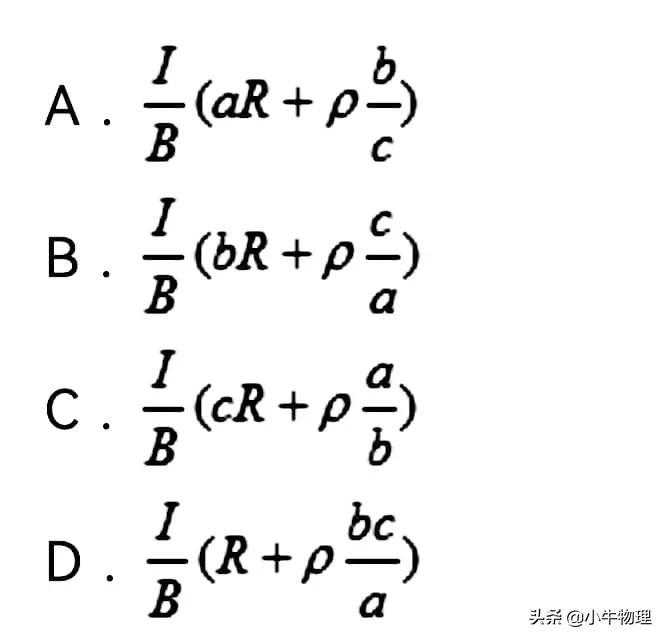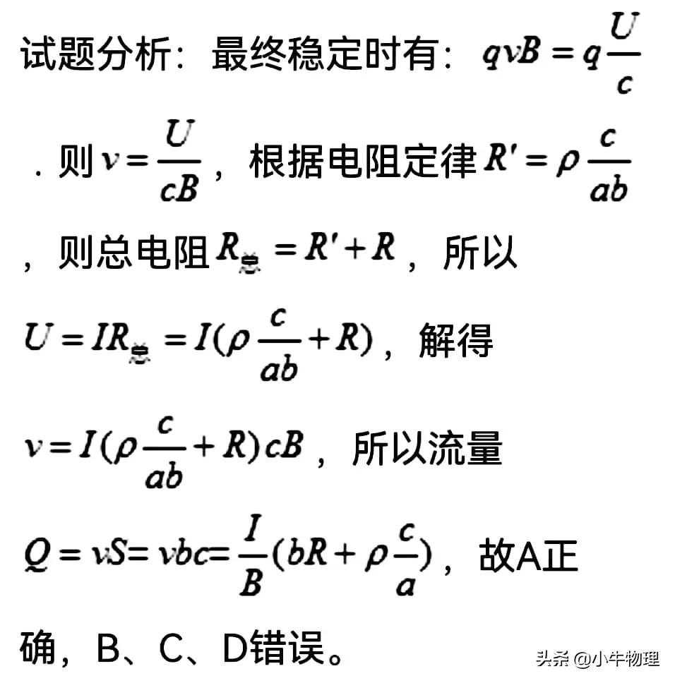 例题:电磁流量计广泛应用于测量可导电流体(如污水)在管中的流量(在单位时间内通过管内横截面的流体的体积)。为了简化,假设流量计是如图所示的横截面为长方形的一段管道,其中空部分的长、宽、高分别为图中的a、b、c。流量计的两端与输送流体的管道相连接(图中虚线)。图中流量计的上下两面是金属材料,前后两面是绝缘材料。现于流量计所在处加磁感应强度为B的匀强磁场,磁场方向垂直于前后两面,当导电流体稳定地流经流量计时,在管外将流量计上、下两表面分别与一串接了电阻R的电流表的两端连接,I表示测得的电流值。已知流体的电阻率为ρ,不计电流表的内阻,则可求得流量为()
