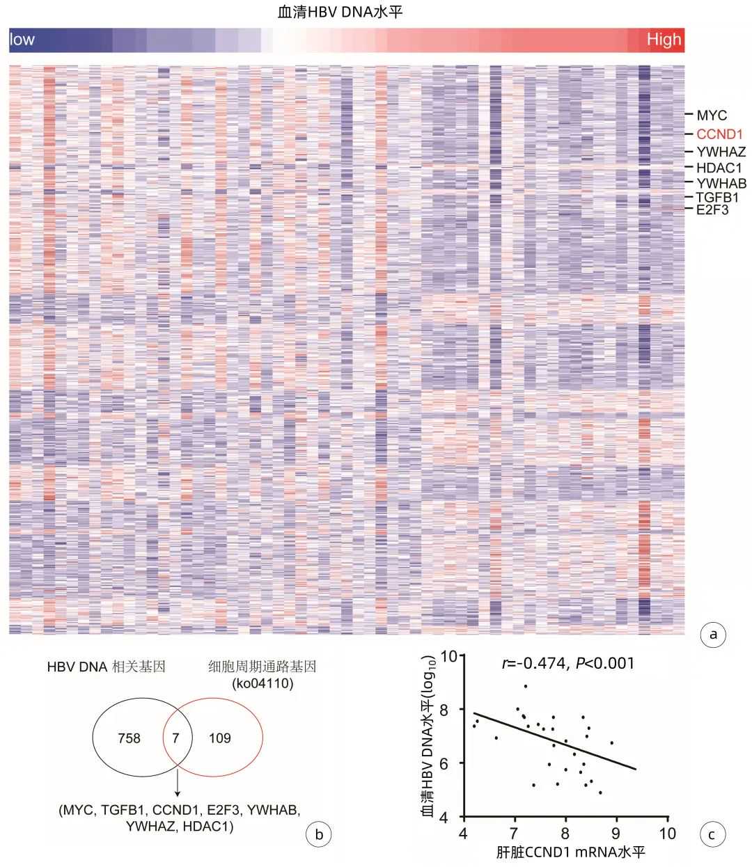 注:a,GSE84044数据集中与患者HBVDNA载量相关的肝组织宿主基因,样本按照HBVDNA载量的高低从左到右排列,蓝色代表低表达,红色代表高表达;b,765个与HBVDNA载量显著相关基因和116个细胞周期基因的交集;c,肝组织中CCND1水平与血清HBVDNA载量之间的相关性分析。