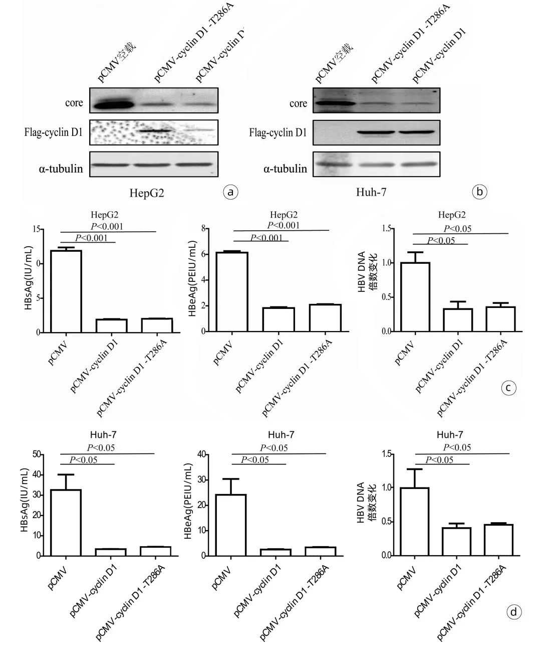注:a、b,外源表达cyclinD1降低HepG2和Huh-7细胞HBVcore蛋白的水平;c、d,外源表达cyclinD1下调HepG2和Huh-7细胞培养上清液中的HBsAg、HBeAg与HBVDNA水平。