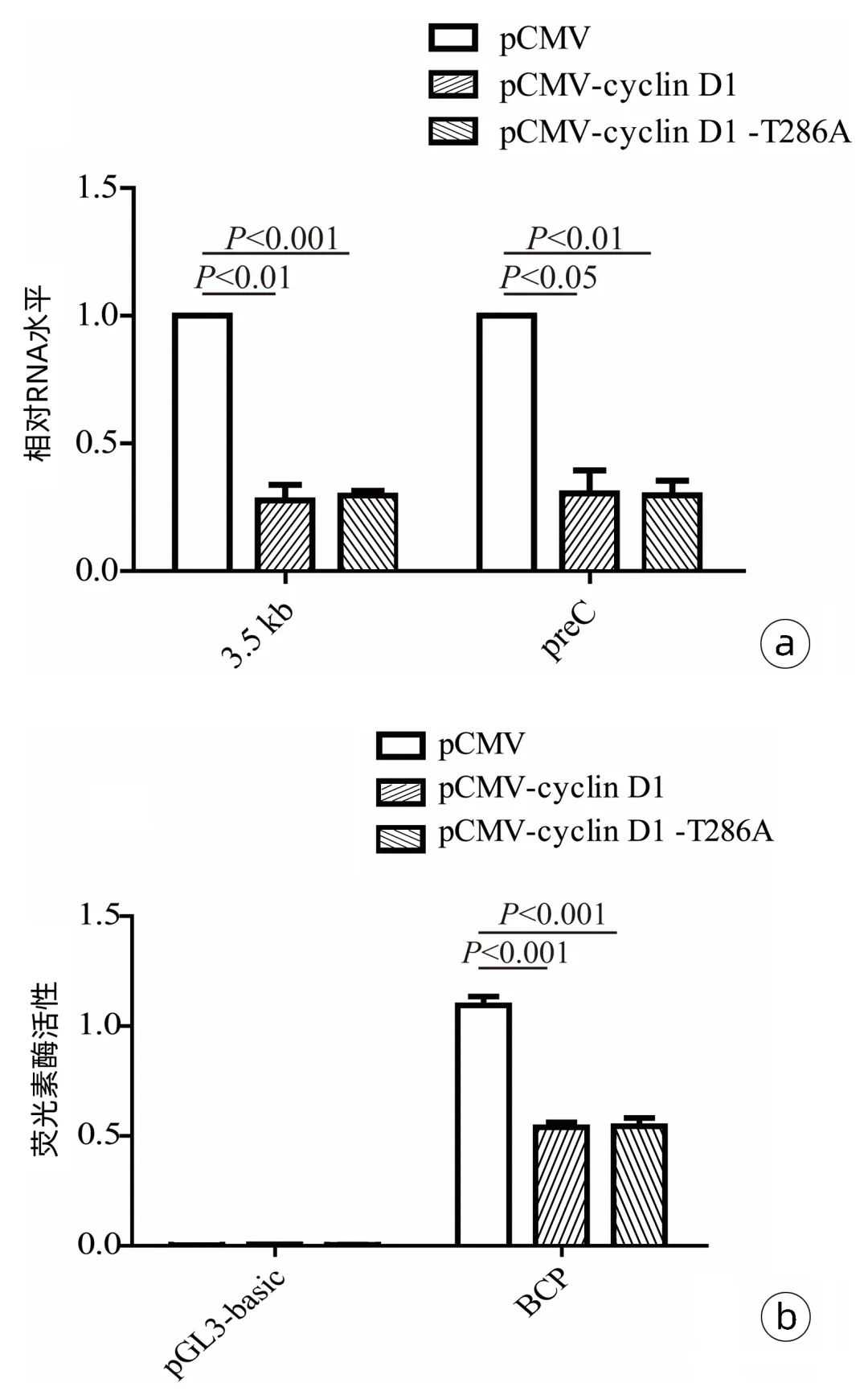 注:a,RT-qPCR检测cyclinD1和cyclinD1(T286A)过表达对HepG2细胞内HBVRNA的影响;b,双荧光素酶报告基因实验检测过表达cyclinD1和cyclinD1(T286A)对HBVBCP启动子活性的影响。
