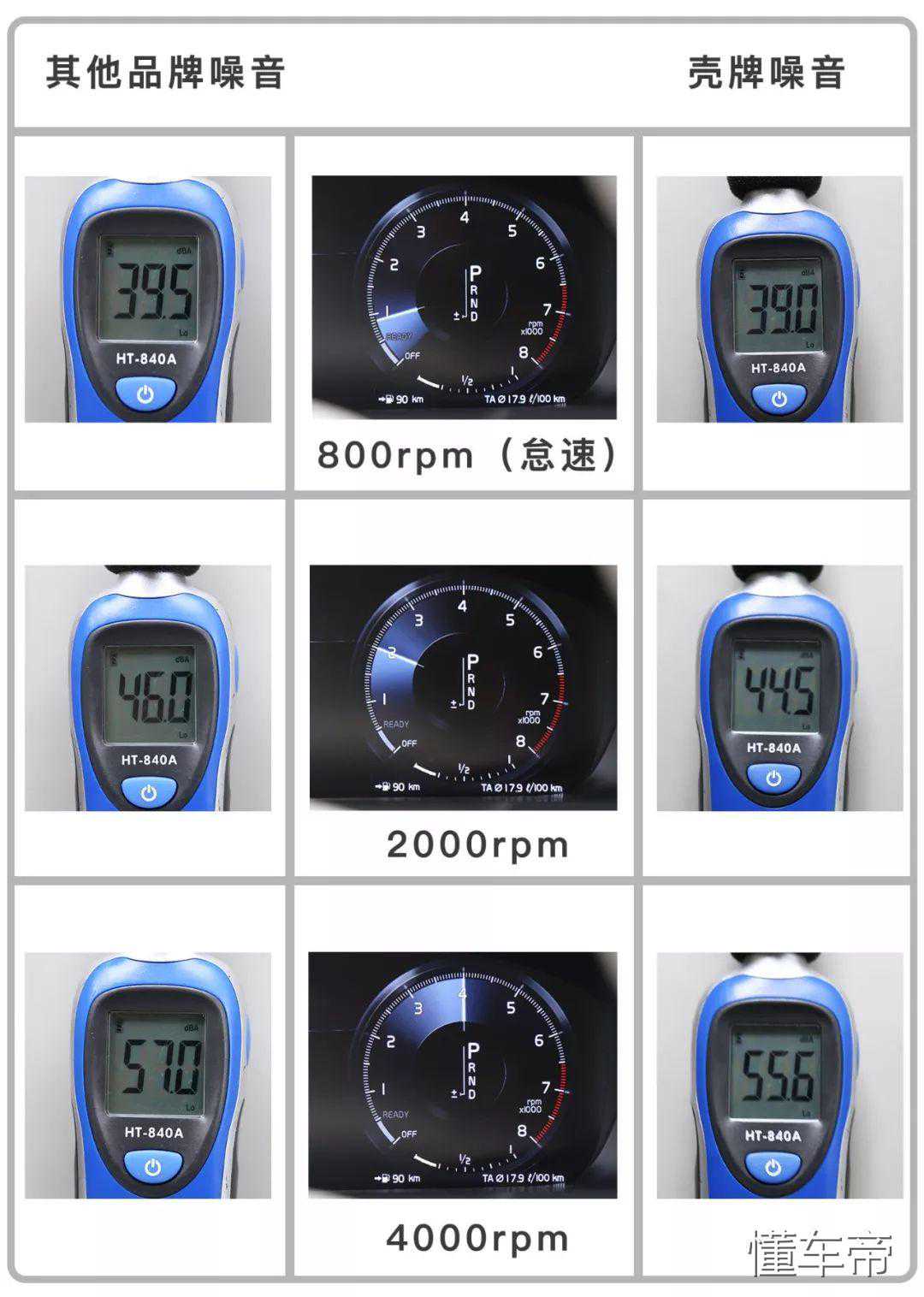 2.噪音测试:用噪音仪分别测试发动机在加注两款润滑油后,不同转速时的噪音情况。润滑油的综合性能越好,发动机运转噪音会越小。