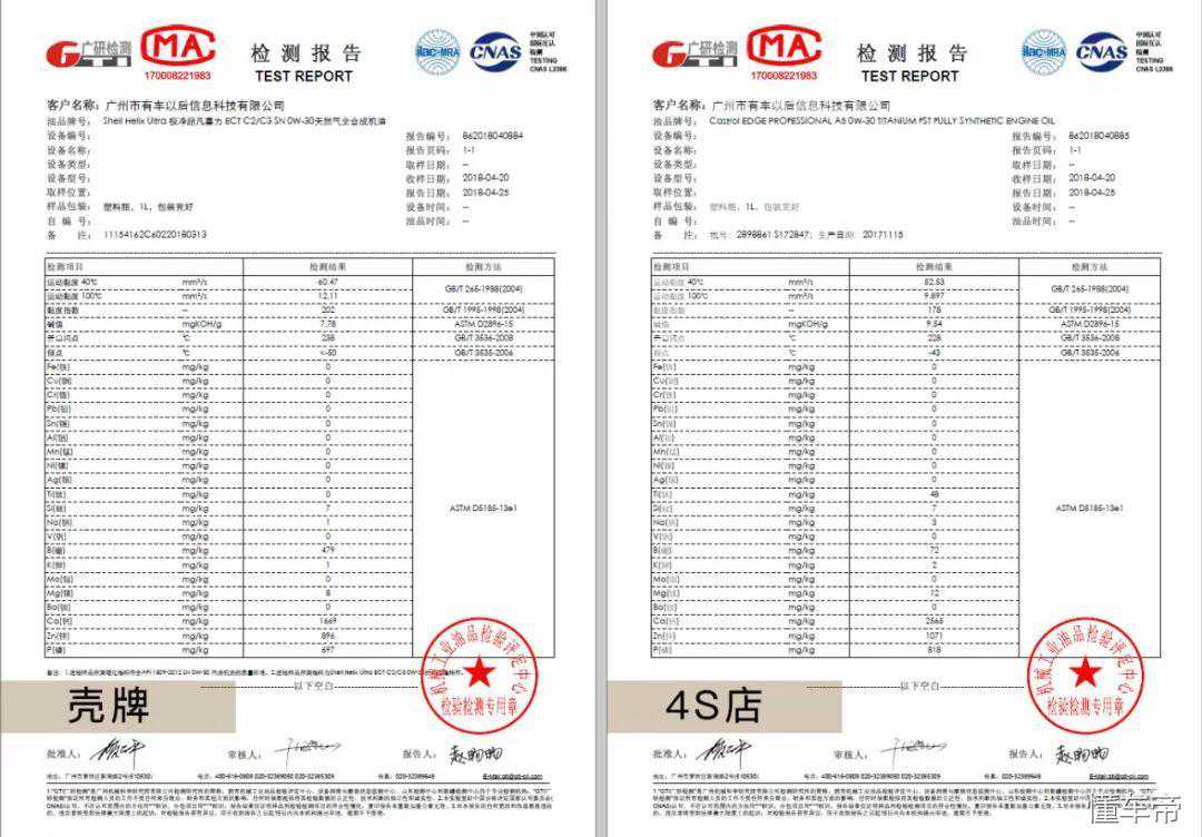 首先,我们将两种润滑油送到专业实验室检测一番